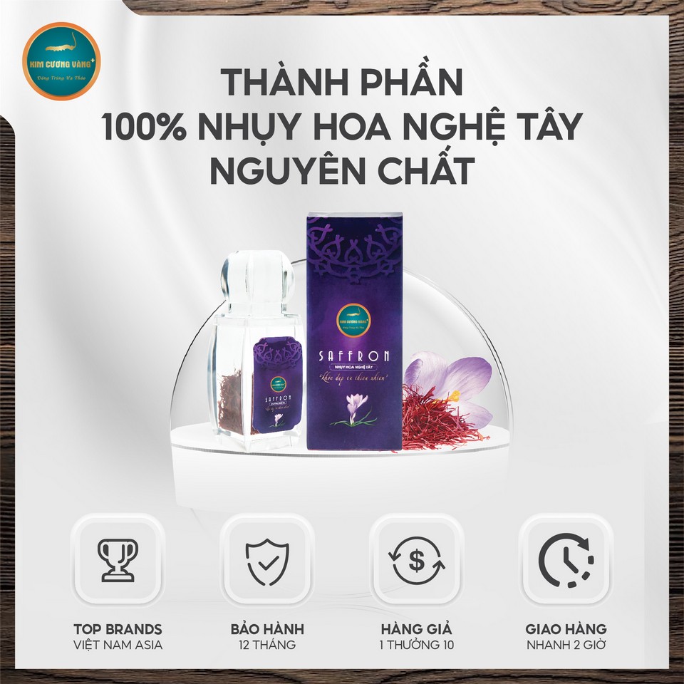 Saffron Kim Cương Vàng là sản phẩm tinh khiết không lẫn tạp chất, chỉ được thu hoạch từ những cây hoa nghệ tây 5 năm tuổi để cho ra những sợi nhụy chất lượng nhất có hàm lượng dưỡng chất cao nhất chứa hàm lượng Cr0cin (>270) cao gấp đôi saffron bình thường.