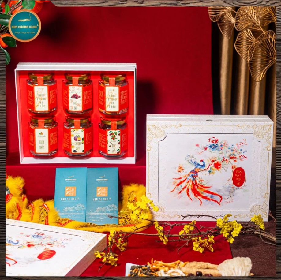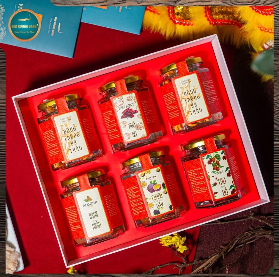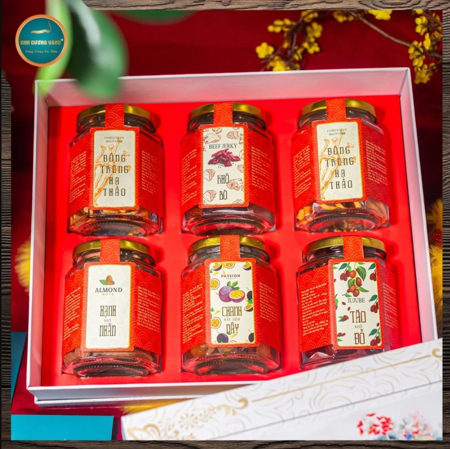 Đông Trùng Hạ Thảo (10g) – Mứt Gừng Sấy Dẻo (100g) hoặc 1 Mứt Vỏ Bưởi Sấy Dẻo (60g) – Khô Bò (80g) – Hạt Hạnh Nhân (170g) – Chanh Dây Sấy Dẻo (120g) – Táo Đỏ Sấy Khô (100g)